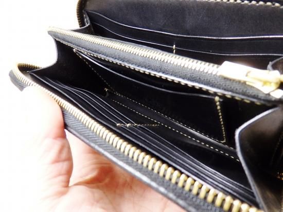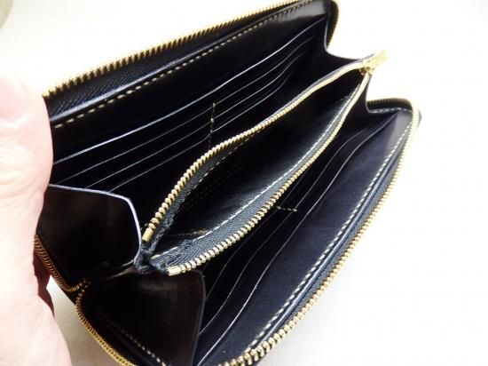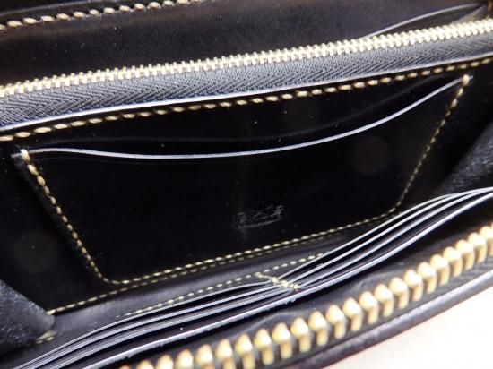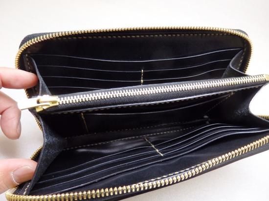 小銭x1、札入れx2、カード入れx12、ライセンスカードx2と収納スペースを多く設け、カードやお札、レシート等を選別して収納出来、使用し易さ、使い勝手も良く、素材全ての良さが現れ、オーダーならではの組み合わせのラウンドウォレットに完成しました。