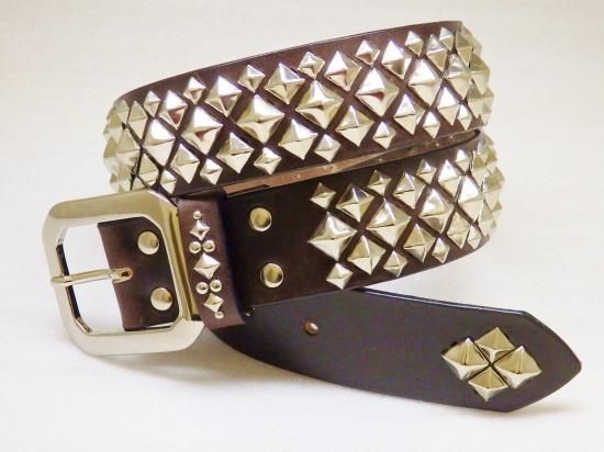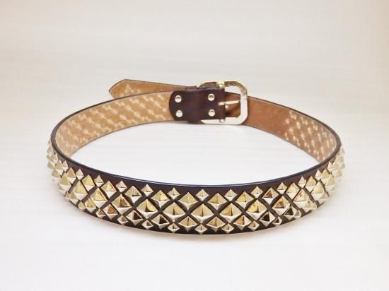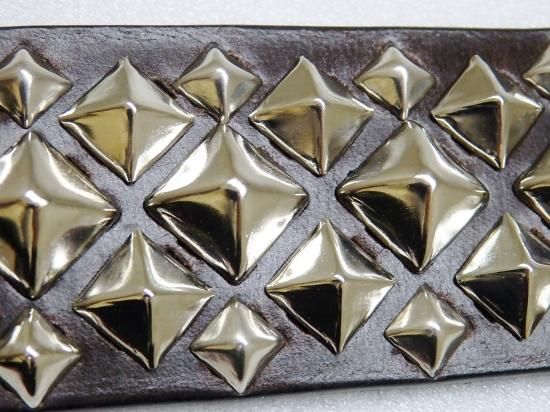 ピラミッドスタッズを3連で打ち込んだベルトを販売しておりますが、頂いたオーダーは、大,中,小のピラミッドスタッズを羅列にセット。剣先にもサイズ違いのピラミッドスタッズ。