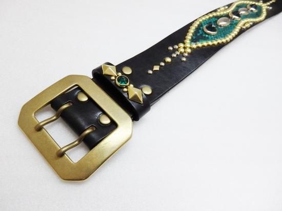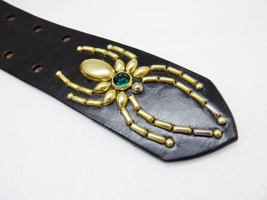 ダイヤモンドパイソンを緑で染色。最大の特徴の柄を消してしまわない様色を調整しながら染色し、剣先にはDIABOLICを代表する蜘蛛のスタッズをセット。怪しい雰囲気がありますが素材の良さが現れ、革の変化やスタッズの擦れやくすみはが味わいながら、長く愛用出来るスタッズベルトに完成しました。