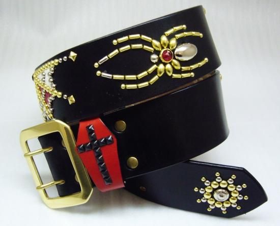 スパイダーウェブは、日章カラーの雰囲気を出す為、赤と白のリザードを組み合わせ、中心のスパイダーウェブに向かい、DIABOLICを代表する蜘蛛のスタッズをセットしました。1つ1つの柄が素晴らしく、そのどれもが全ての柄とバランスが良く、共鳴し合い最高のスタッズベルトに完成しました。