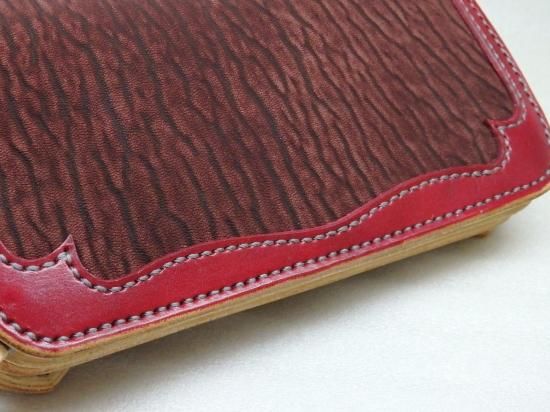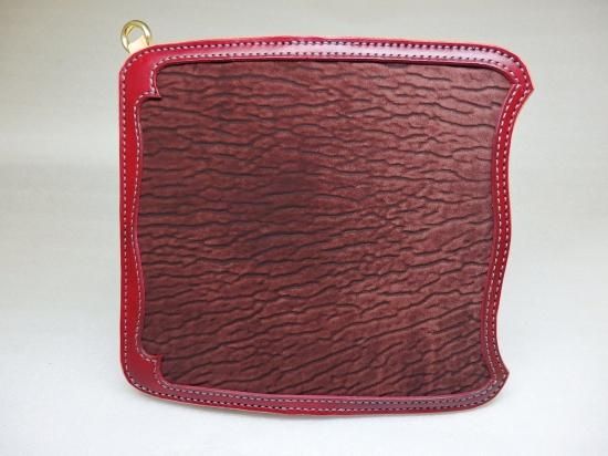 縁は、手染めしましたサドルレザーを使用し、アザラシ革は、独特の波状の畝(ウネ)模様があるのが特徴で、手染めとアザラシ革の色合いが独特の雰囲気が出ております。