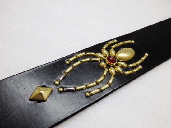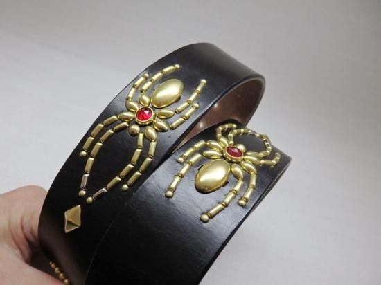 お客様のご要望はベルトの中心部に、1点物のオーダーならではのショップ名をスタッズで入れ、後はお任せ。とのご注文でした。最高峰のUKサドルレザーに、ショップ名、DIABOLICらしく蜘蛛のスタッズを打ち込みが存在感のあるにスタッズベルトに完成しました。