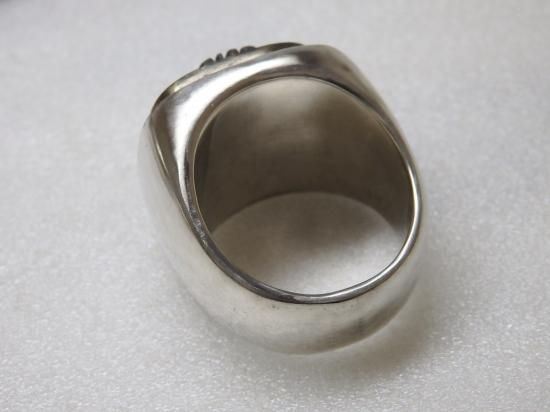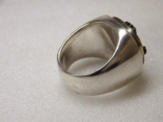 リングはシルバーを使用し柄等無でプレーン、リングに乗せる上の部分には、チームロゴとマークをを彫り込み真鍮で製作。細かい修正を繰り返しながら、燻しの入れ方もモチーフの周りから少し自然な感じで燻しがグラデーションの様な不規則にかかりつつ、真鍮が見えるのが理想。との事で試行錯誤して研磨し、シルバーは、くすんだ雰囲気で。との事でいつもと違う研磨を施しました。