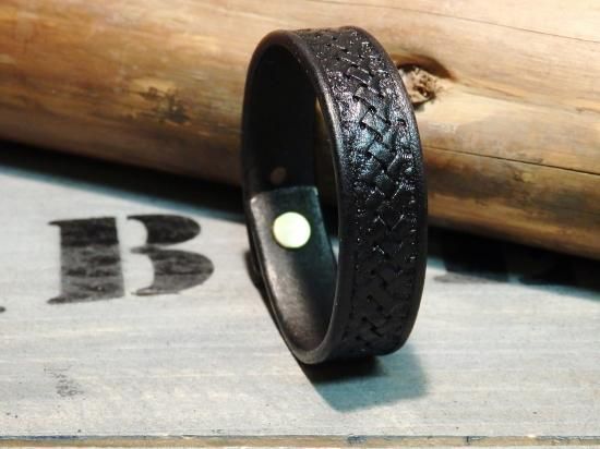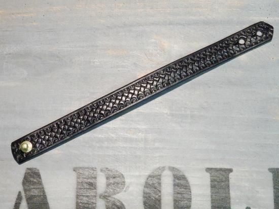 革の良さを味わいたい。との事で、シンプルですが、刻印の彫りは深く、革の味わいを充分に楽しめるブレスレットに完成しました。