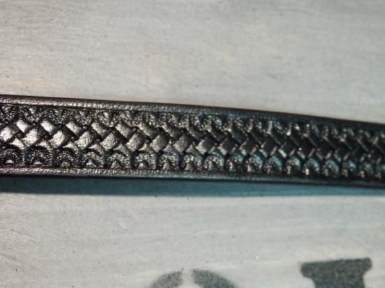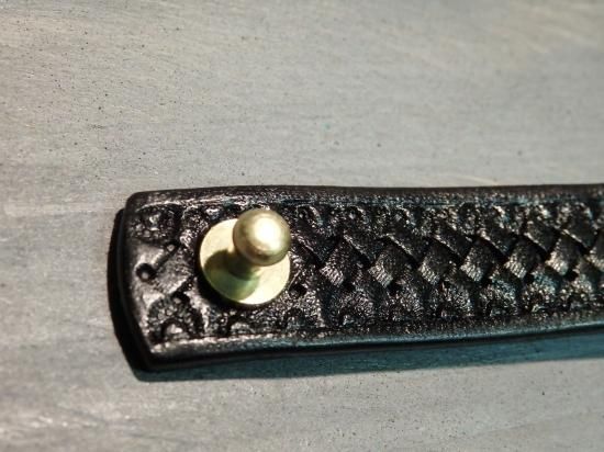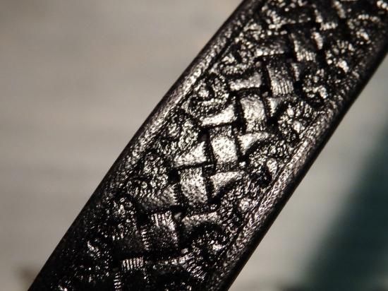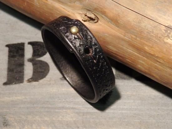 お客様のご要望で、バスケットの刻印を打ち、その後に黒に手染めを施し、スタッズ等無しで、刻印と