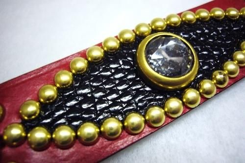 溺愛されている愛犬の為、最高峰のUKサドルレザーとスタッズを使用し、剣先にはカスタムパーツ、インレイにリザードを使用を上品でインパクトのあるの首輪に完成致しました。
