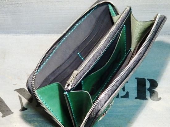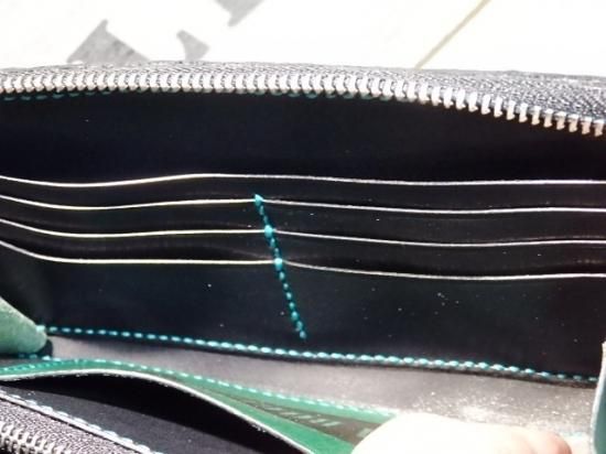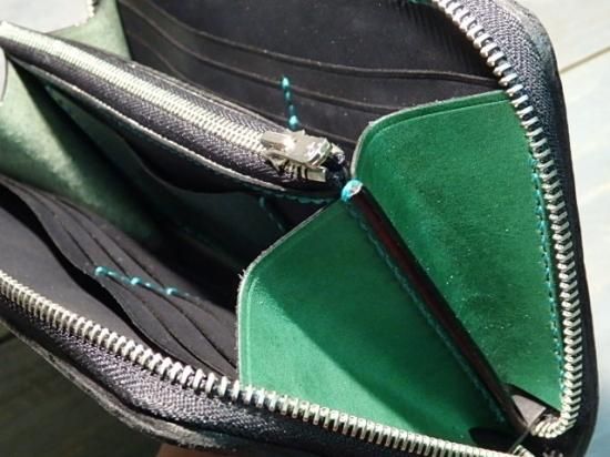 小銭x1、札入れx2、カード入れx12、ライセンスカードx2と収納スペースを多く設け、カードやお札、レシート等を選別して収納出来、使用し易さ、使い勝手も良く、素材全ての良さが現れ、オーダーならではの組み合わせのラウンドウォレットに完成しました。