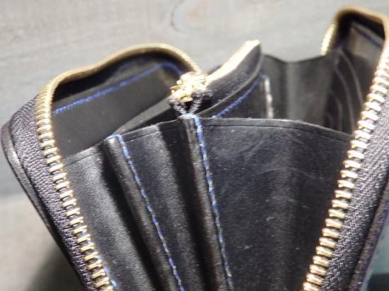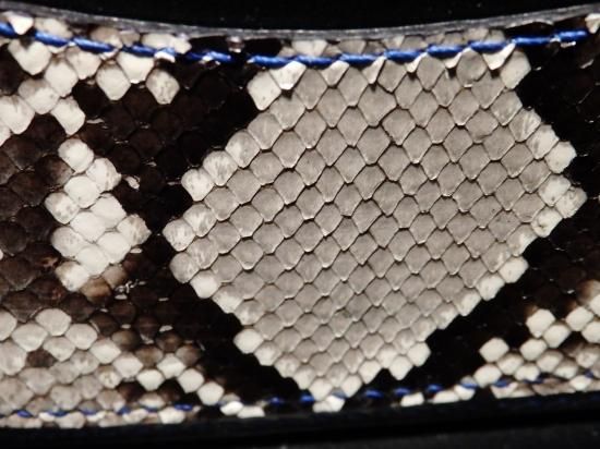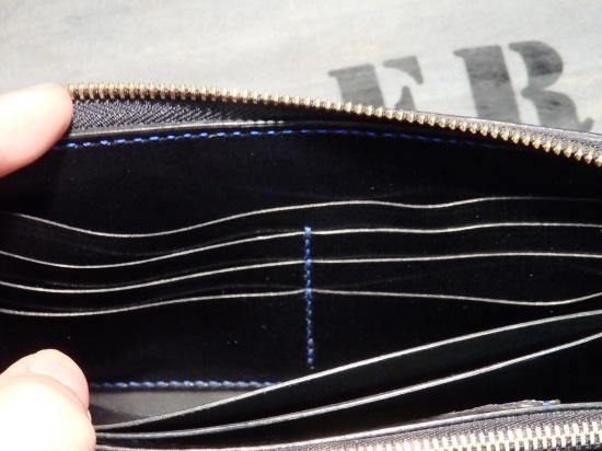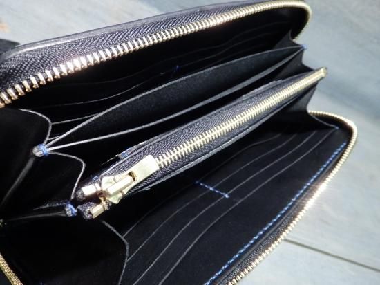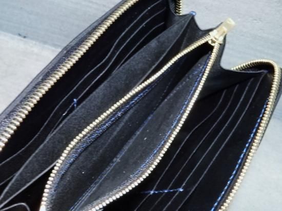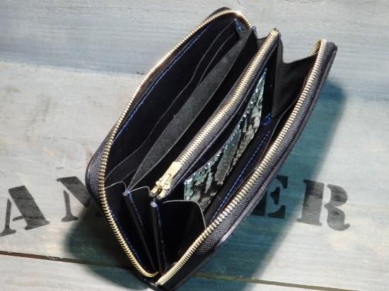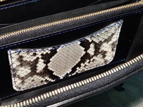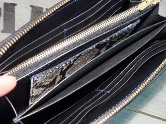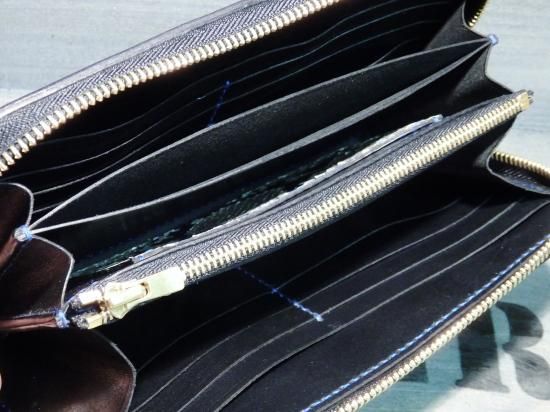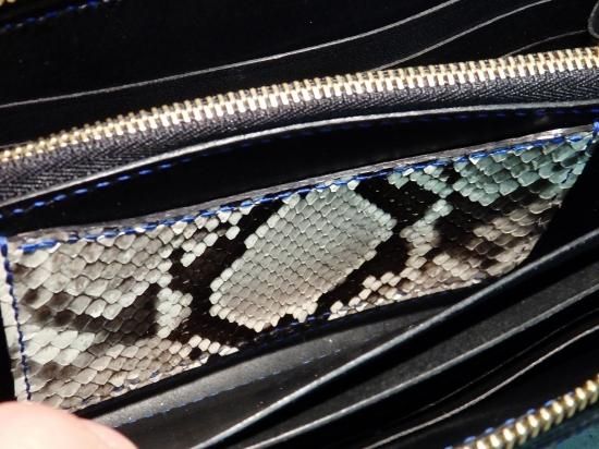 内側は、札入れに仕切りを入れ、通常な2か所ですが3か所にし、小銭x1、札入れx3、カード入れx12、ライセンスカードの部分にダイヤモンドパイソンをセットと収納スペースを多く設け、カードやお札、レシート等を選別して収納出来、使用し易さ、使い勝手も良く、素材全ての良さが現れ、オーダーならではの内側の構造のラウンドジップウォレットに完成しました。