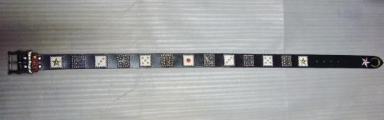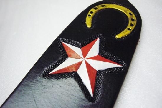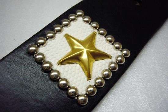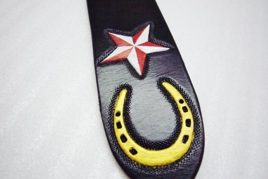 ダイスを綺麗に配列し、インレイはリザード。中心部にはハイドームをセットし左右のバランスがとても良く、剣先にはオールド風の蹄と星をカービング。全体の柄と色合いのバランスが良く、共鳴し合い最高のスタッズベルトに完成しました。