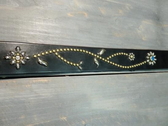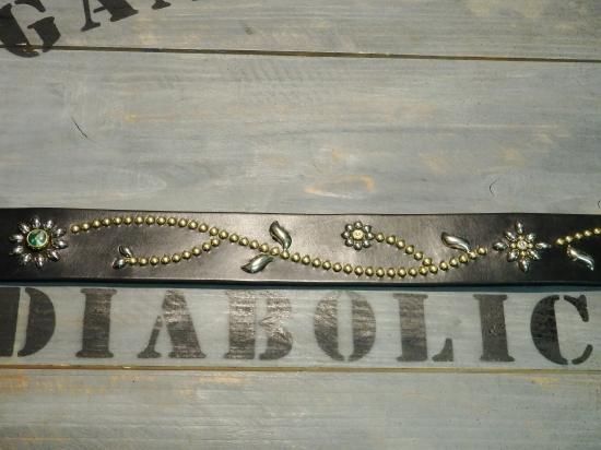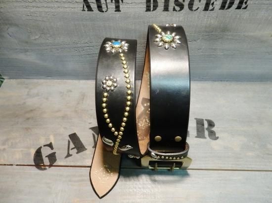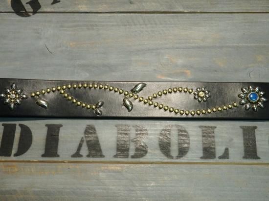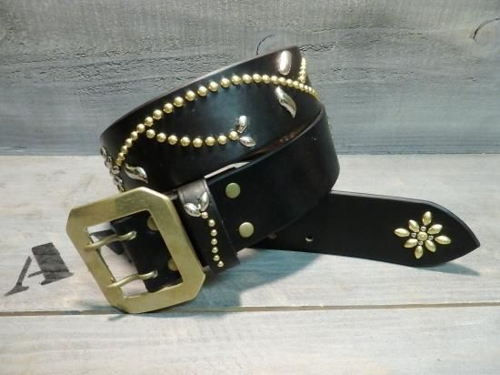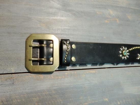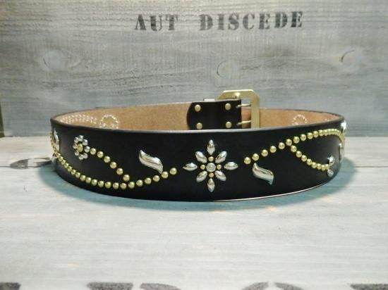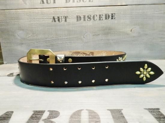 スタッズとラインストーンUKサドルレザーに打ち込んだフラワーモチーフのスタッズベルト。