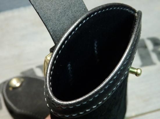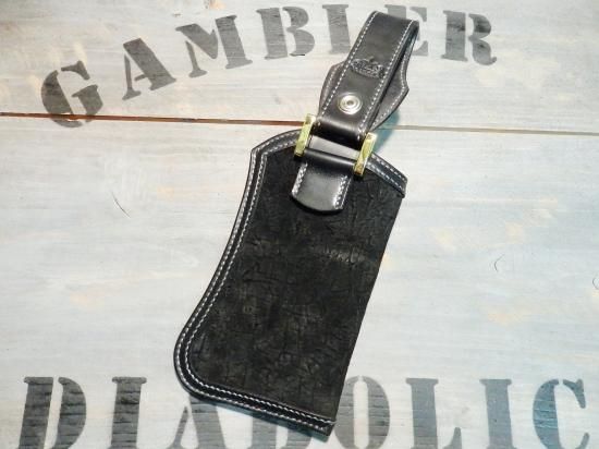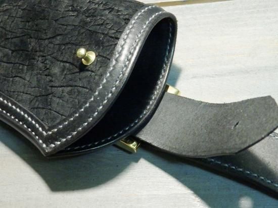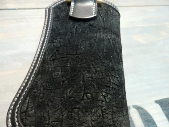 カバの革の表面はヌバック・スエード状で、網目状の深いしわが見られ、模様が深く入っている部位とそうでない部位があり、それが濃淡のある表情で存在感があり、ベルトにぶら下げて使用するのでベルトループはサドルレザーで製作。お客様の使用しているスマートフォンのサイズに合わせて製作で使い込む程に出る革の経年変化が味わえるスマートフォンケースに完成しました。