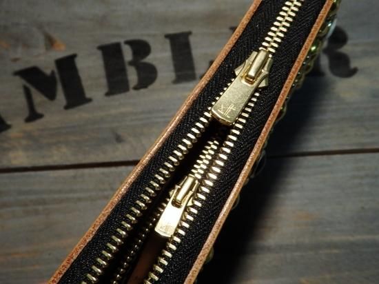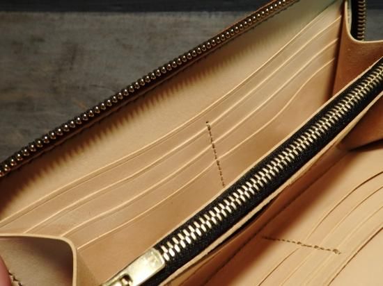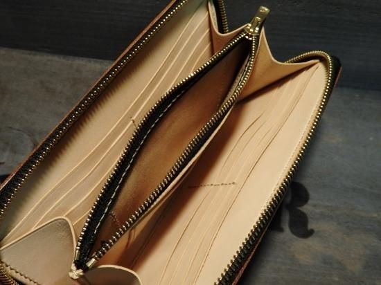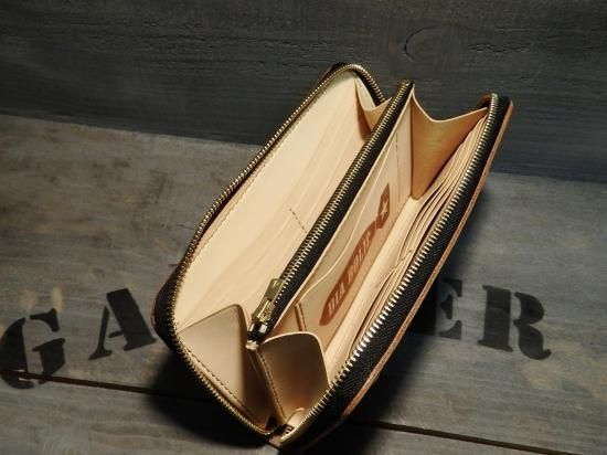 小銭x1、札入れx2、カード入れx12、ライセンスカードx2と収納スペースを多く設け、カードやお札、レシート等を選別して収納出来、使用し易さ、使い勝手も良く、素材全ての良さが現れ、オーダーならではの組み合わせのラウンドジップウォレットに完成しました。