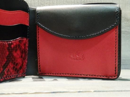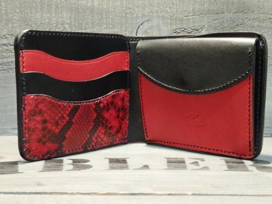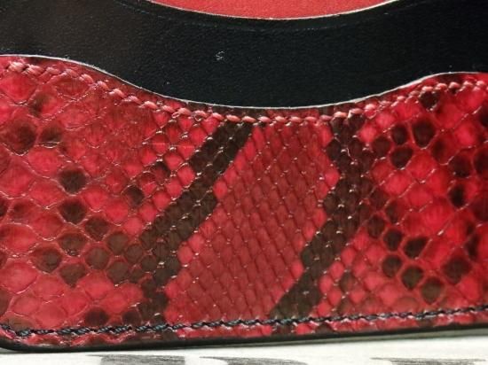 お客様より、内側は黒と赤、カード段部分には赤で手染めを施したダイヤモンドパイソンをセット。