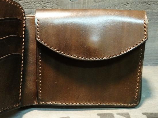 お客様より、表側にはバスケットスタンプ、手染め、内側のカード段部分に名前を打刻。プレゼントという事で落ち着いた色合いで、使い込む程に変わる変化を楽しみながら使用出来るウォレットに完成しました。