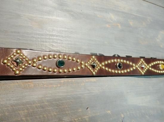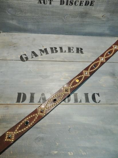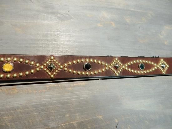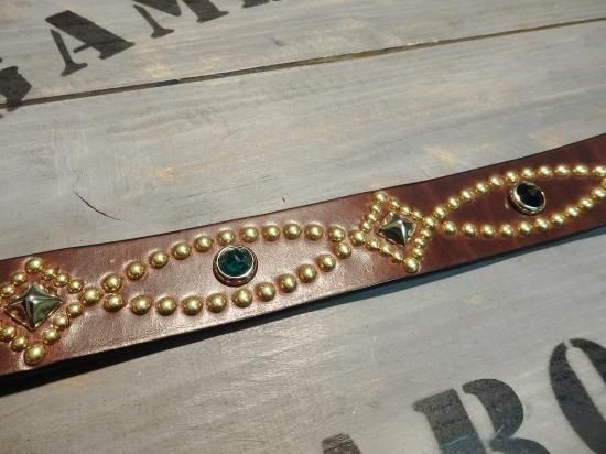 お客様のサイズに合わせ、スタッズとラインストーンを肉厚のサドルレザーに、