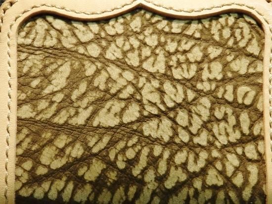 革の特徴は、柔らかいスエード革で、独特の光沢があり、天然の独特な模様でしっかりした凹凸、