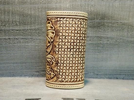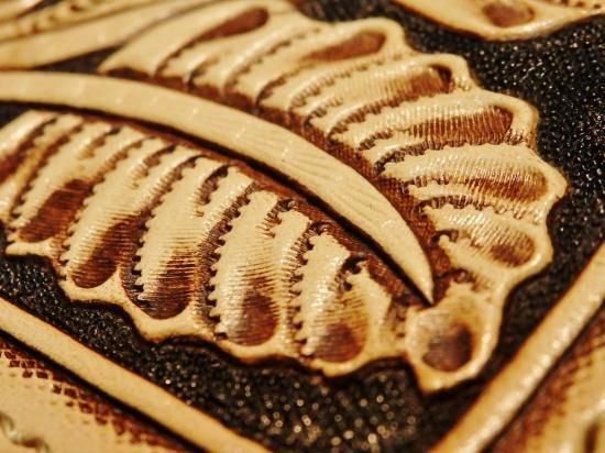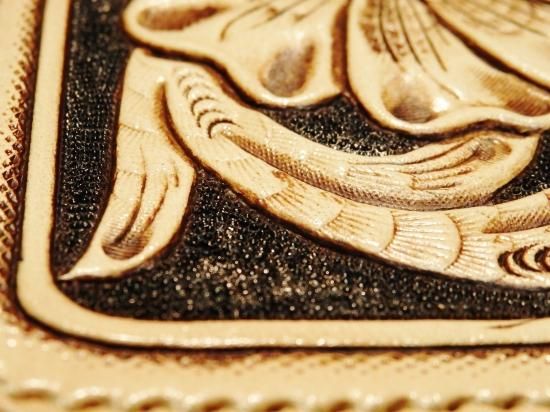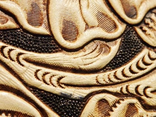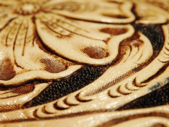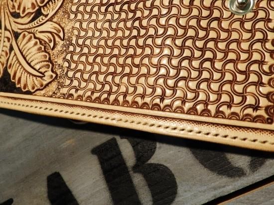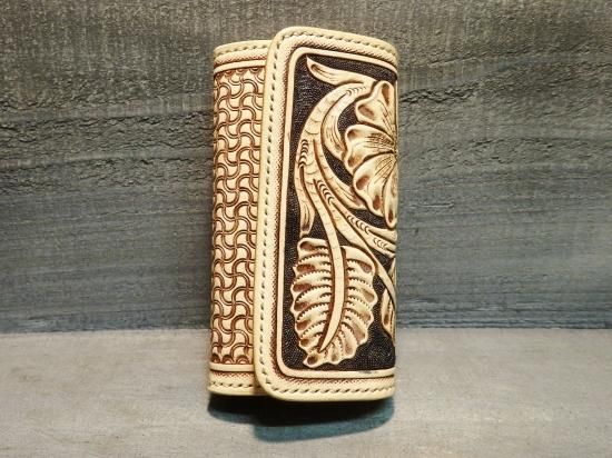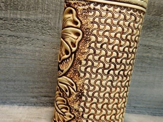 キーケースの限られたサイズに花や葉とその周りは最小限におさえ、周りを黒に染色した事でより立体感を強調し、繊細で柔らかい流局が特徴で、お客様のご希望でジオメトリックスタンプ(幾何学模様)を打ち込み、アンティークを施しました。