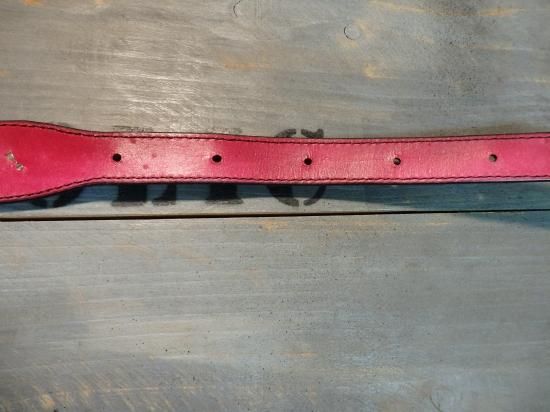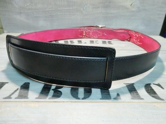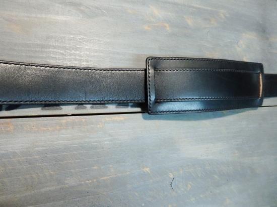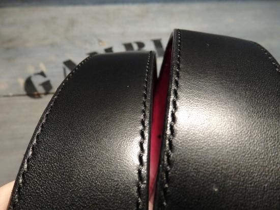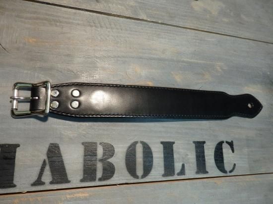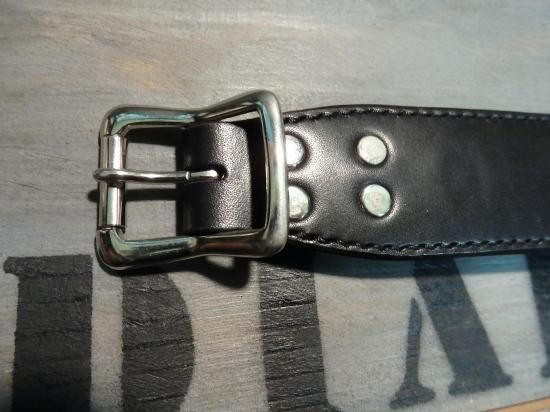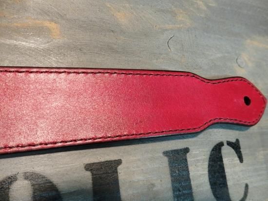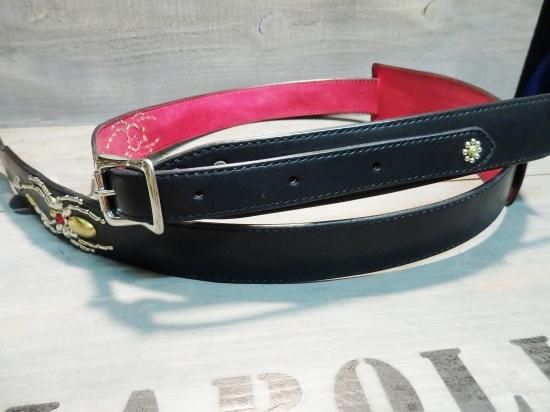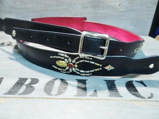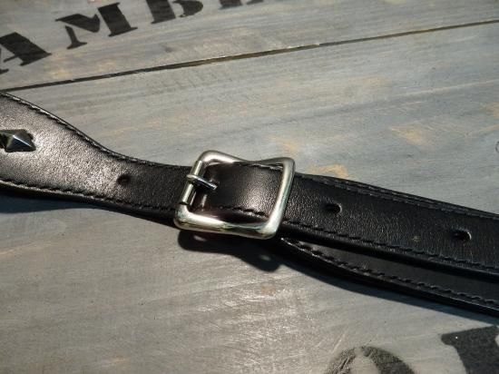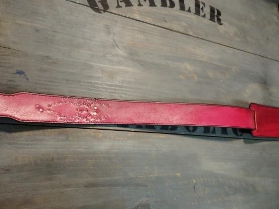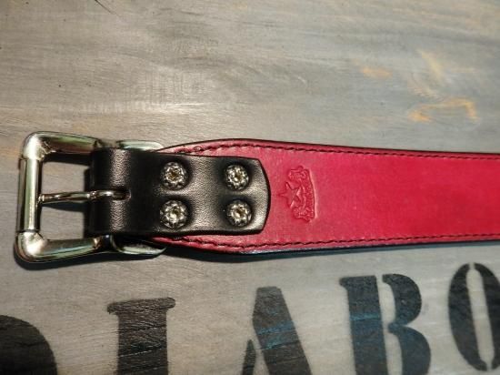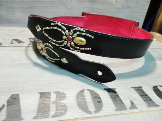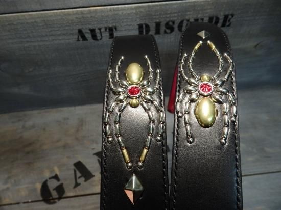 幅4cmで、表は黒のサドルレザー、裏は手染めの赤のサドルレザーを使用し、スパイダースタッズをセット。