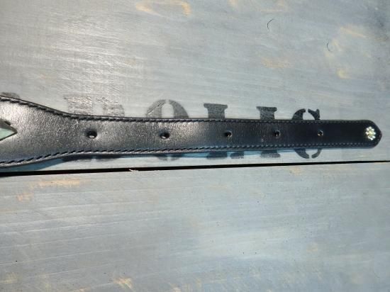 全体のデザインのバランスがずれない様、そして、肩に擦れてしまう事を考えパットを付けました。さらに強度を保つためにステッチを施し、幅、サイズ共に迫力があり、素材だけではなく、全ての組み合わせが素晴らしいギターストラップに完成しました。