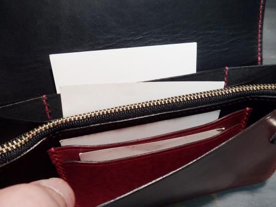内側は、ルガトーレザーと黒のサドルレザーを使用し、収納は少なめですが通常より少し大き目のサイズですので、