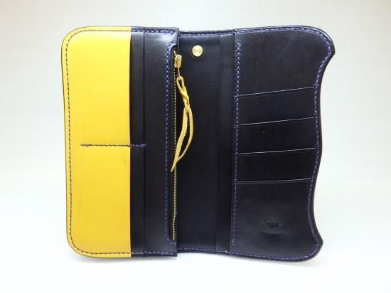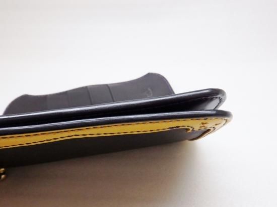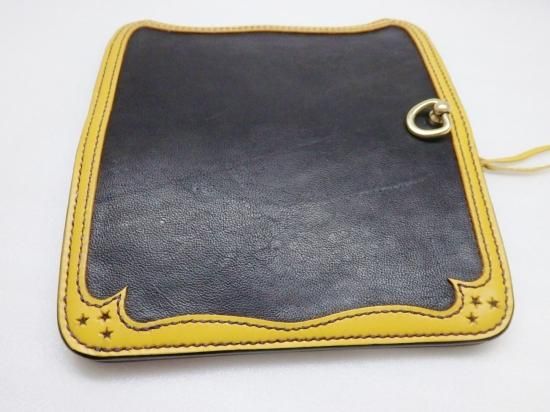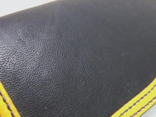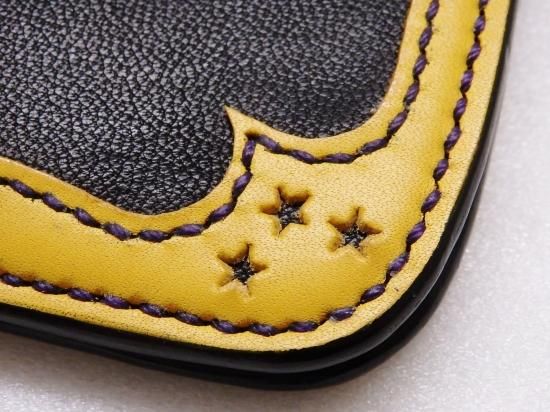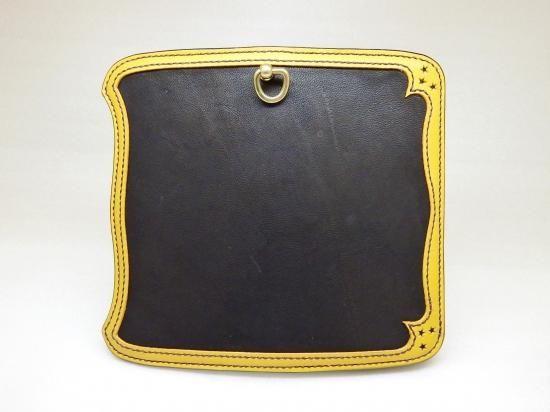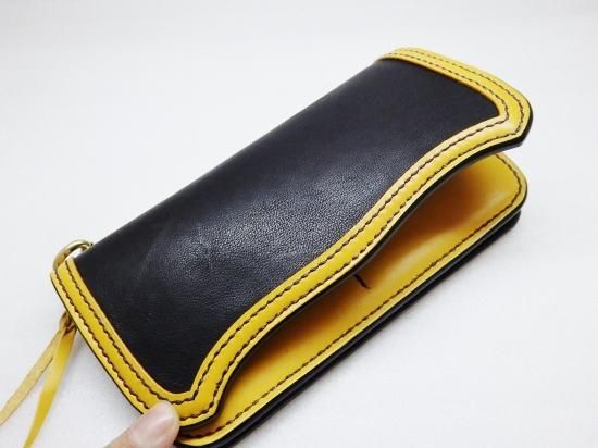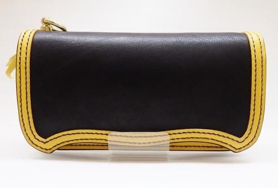 大きな体とは裏腹に、革小物として利用できる採取量はほんのわずかでその為、希少価値の高い革を使用し、縁はカラーサドルレザーを使用。黒と黄色の色合いも良く、