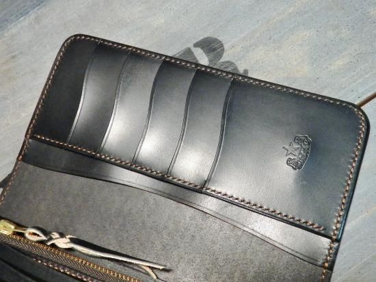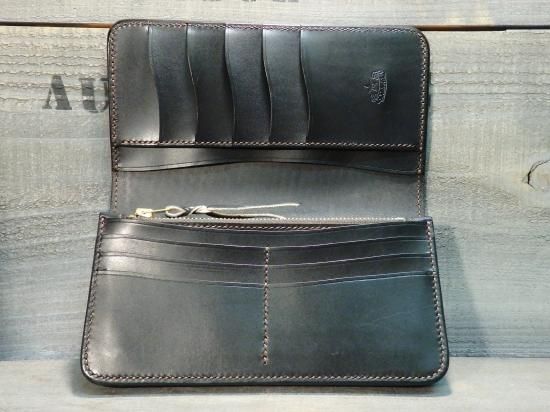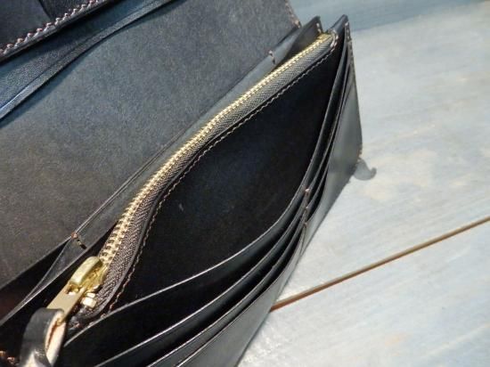 丁寧に打ち込まれたスタンプの彫りが深く存在感があり、堅牢な革に相反して、使い込む程深い味わいが増し、お客様のご希望のTALON ZIPを使用。オーダーならではの組み合わで、使い込む程に変わる変化を楽しみながら使用出来るウォレットに完成しました。