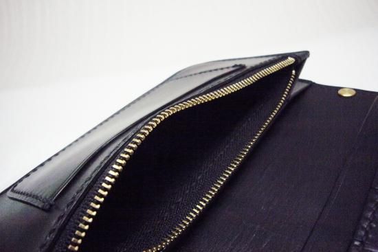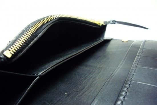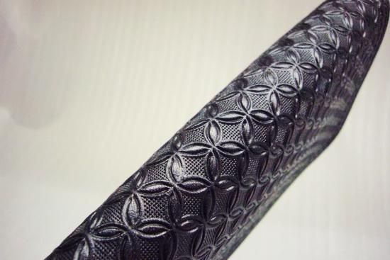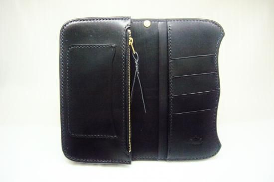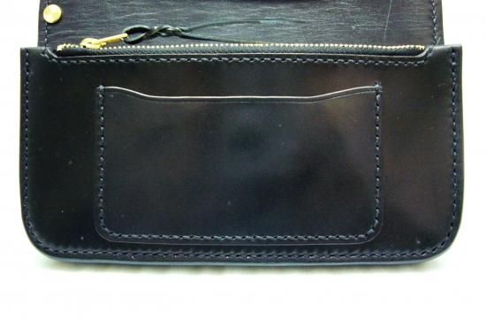 丁寧に打ち込まれたスタンプの彫りが深く存在感があり、堅牢な革に相反して、使い込む程深い味わいが増し、スタッズ等無しで、刻印のみですが、使い込む程に変わる変化を楽しみながら使用出来るウォレットに完成しました。