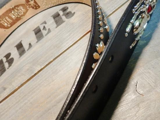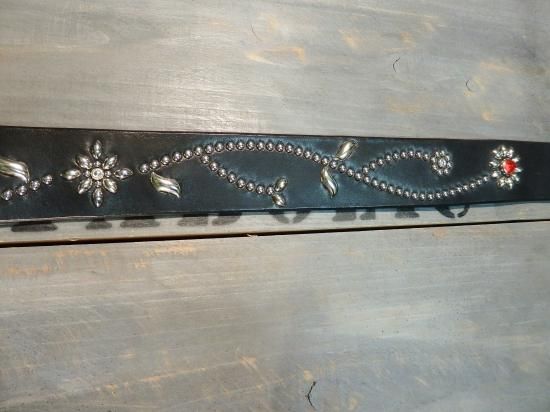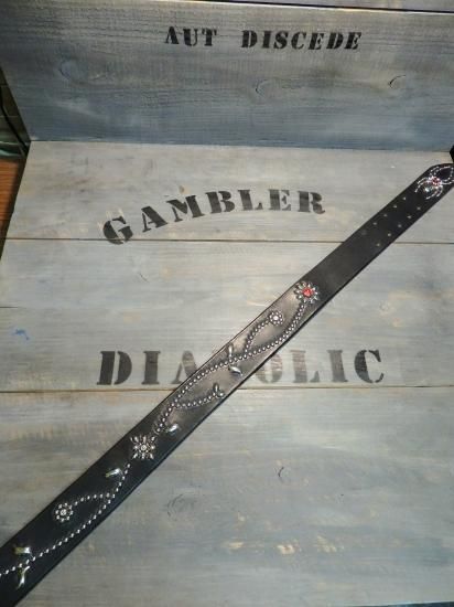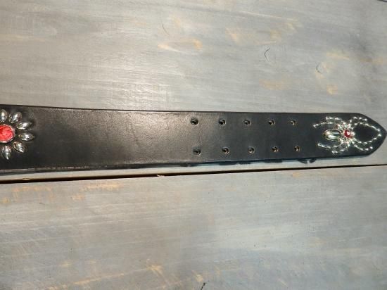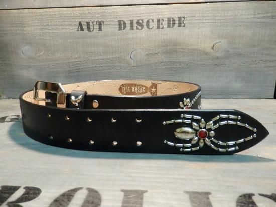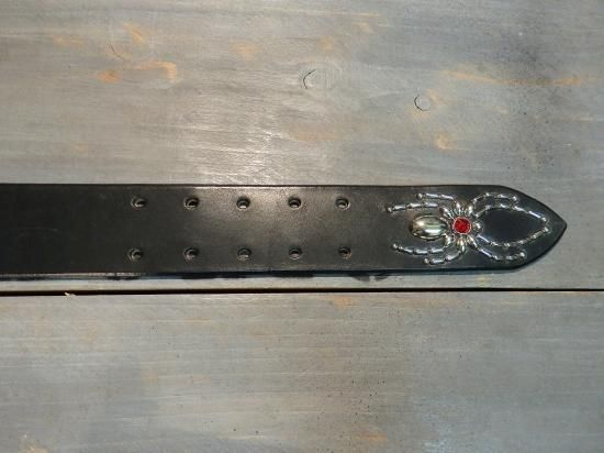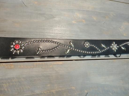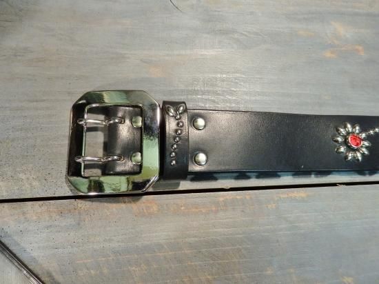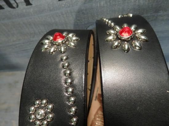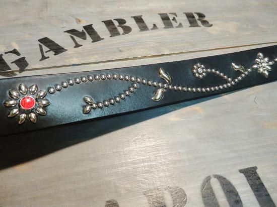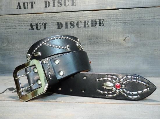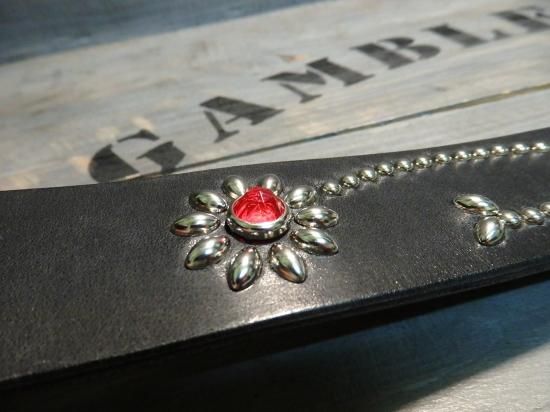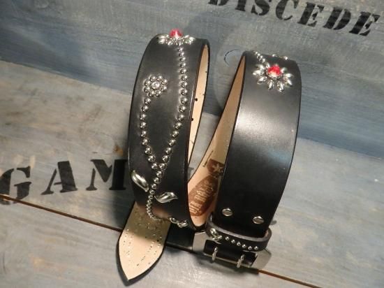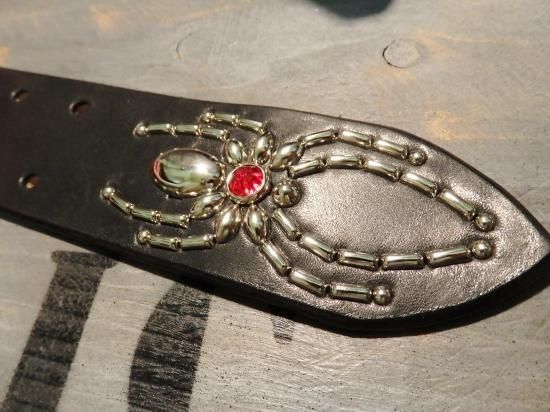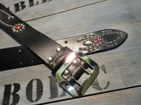 オンラインショップにあるフラワースタッズベルトをベースに、お客様のサイズに合わせ、スタッズは全てニッケル、ラインストーンは全て赤で統一。又、ご要望で、ベルトの剣先にスパイダーをセット。