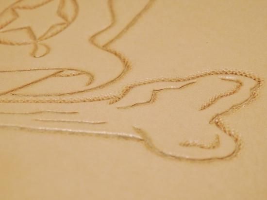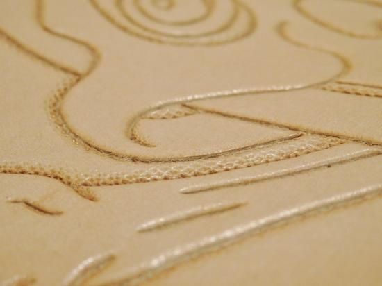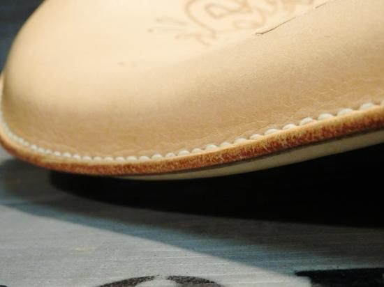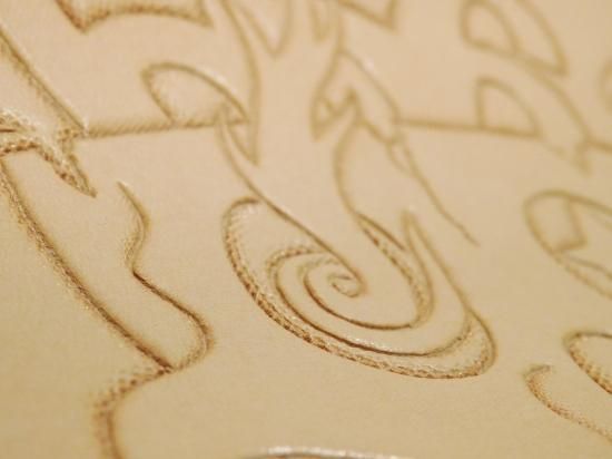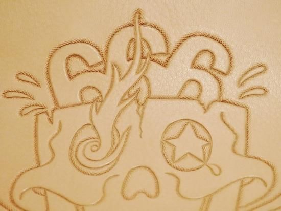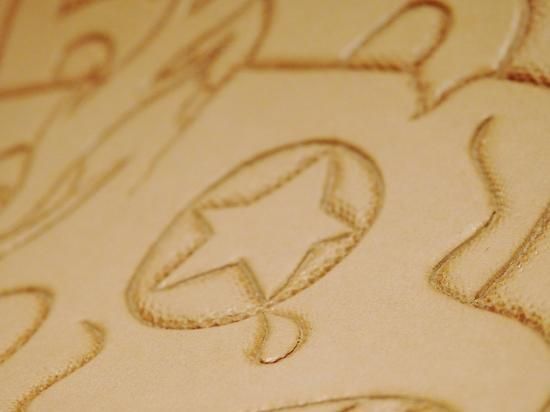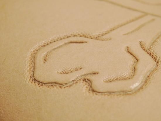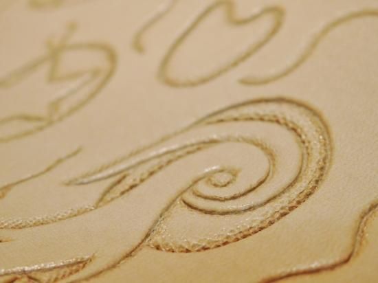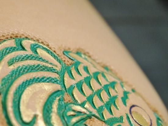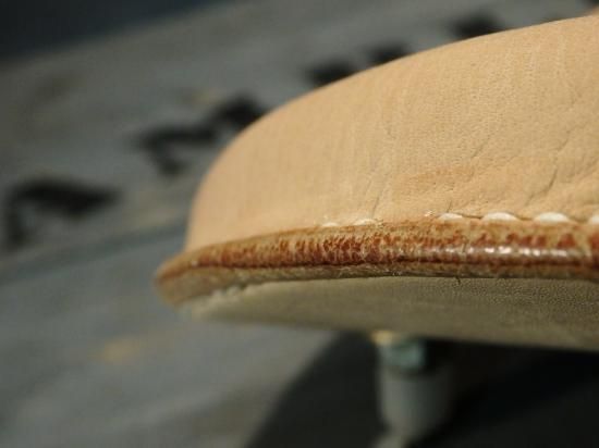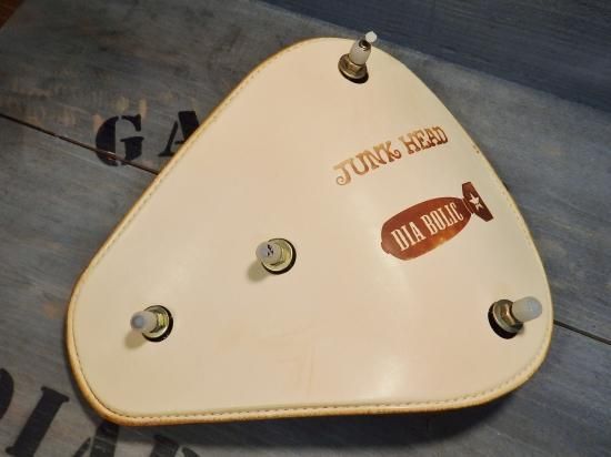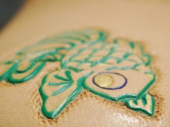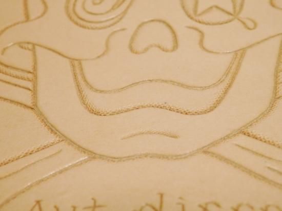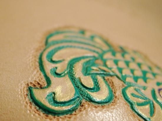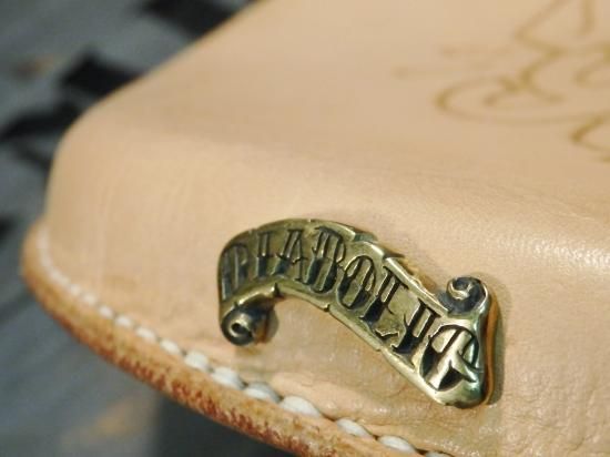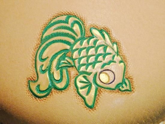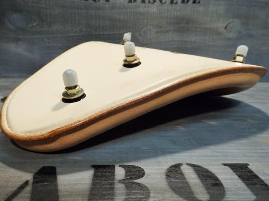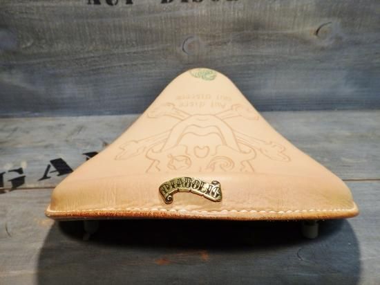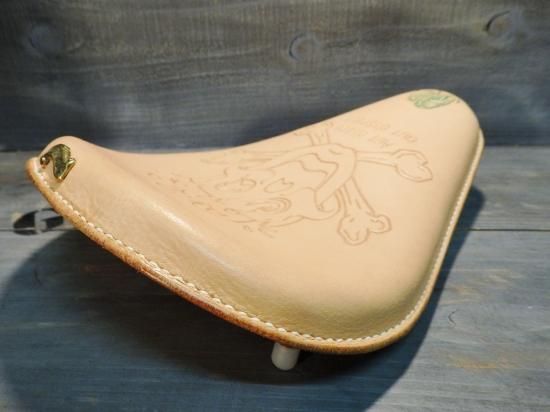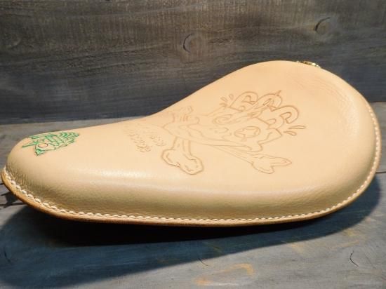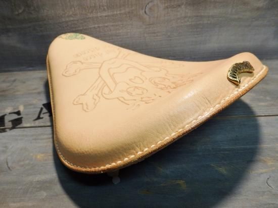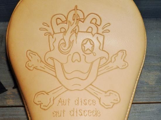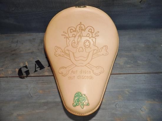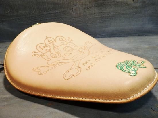 立体感のあるカービングで、DIABOLICのスカルはナチュラルなままにし、金魚は染色。又、シートの後ろにDIABOLICのリボをセット。使い込む程に飴色への変化が楽しみなバイクシートに完成しました。