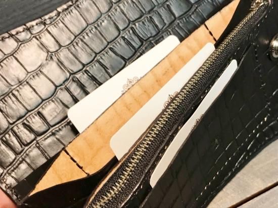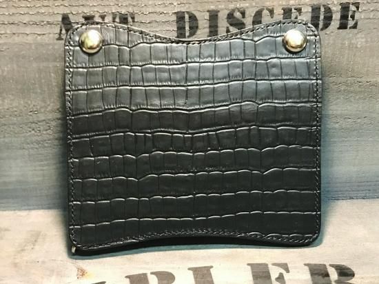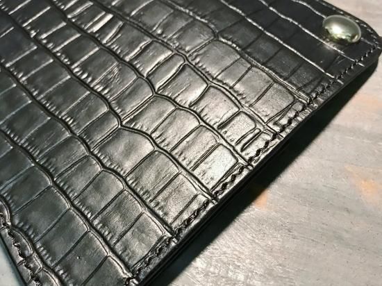 サドルレザーにクロコダイルの模様をエンボス(型押し)を使用したトラッカーウォレット。