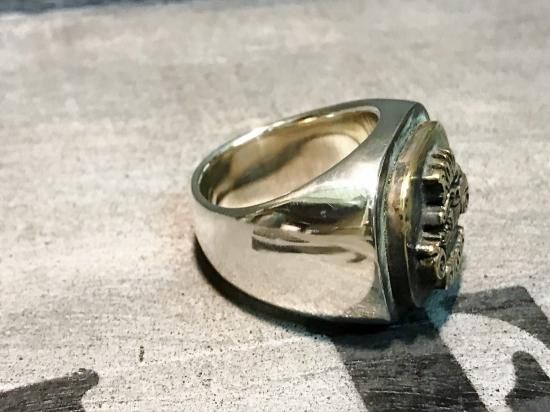 リングはシルバーを使用し柄等無でプレーン、リングに乗せる上の部分には、チームロゴとマークをを彫り込み真鍮で製作。細かい修正を繰り返しながら、燻しの入れ方もモチーフの周りから少し自然な感じで燻しがグラデーションの様な不規則にかかりつつ、真鍮が見えるのが理想。との事で試行錯誤して研磨し、シルバーは、くすんだ雰囲気で。との事でいつもと違う研磨を施しました。