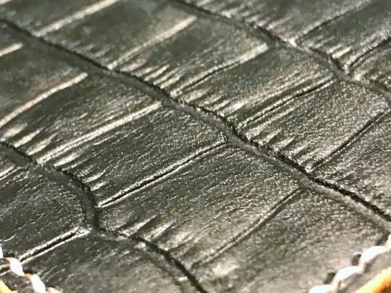 サドルレザーにクロコダイルの模様をエンボス(型押し)を使用したトラッカーウォレット。