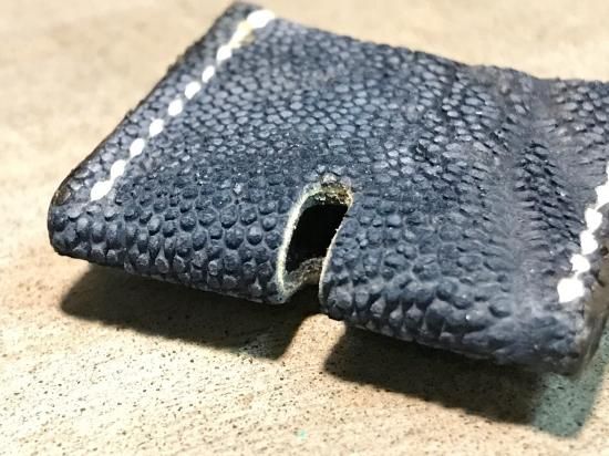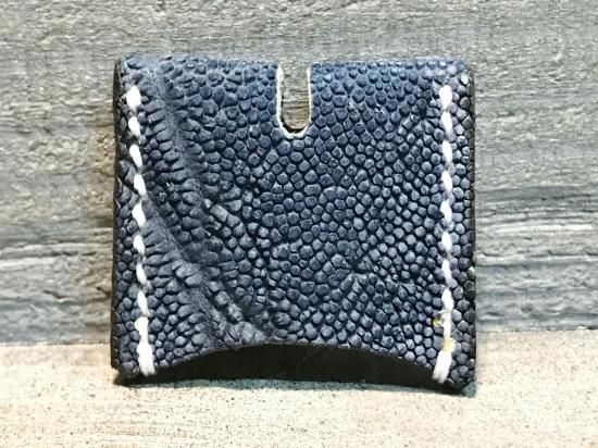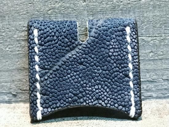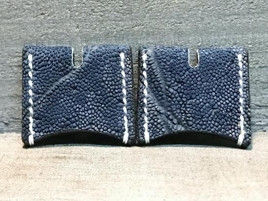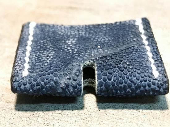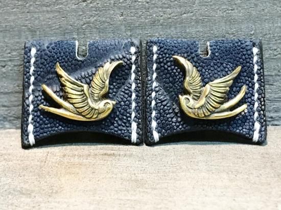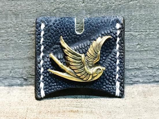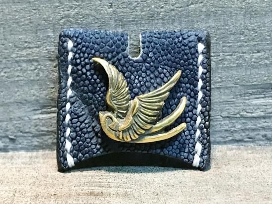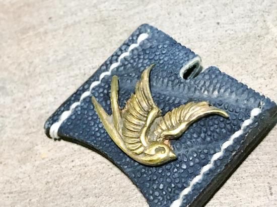お客様より、革はエレファントレザー(デニム)、ステッチの糸は白、スワロー/カスタムパーツ/BRASS(左右)を各々にスワローを。と詳細を頂き、オーダーならではの組み合わせで、使い込む程に艶が増して行くキーカバーに完成しました。