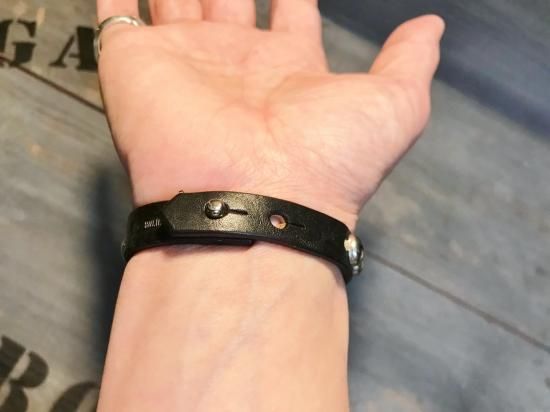 1.3cm幅ですので手首の圧迫感も無く、腕時計やシルバーバングル等されている方でも、重ね付けに。2つのホールが御座いますので、男性には18.0cm、女性は16.5cmで合せて欲しいブレスレットです。