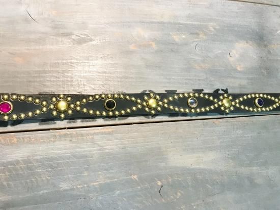 お客様のサイズに合わせ、スタッズとラインストーンを肉厚のサドルレザーに、
