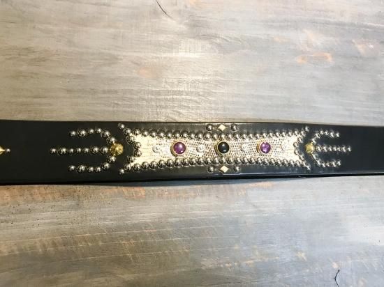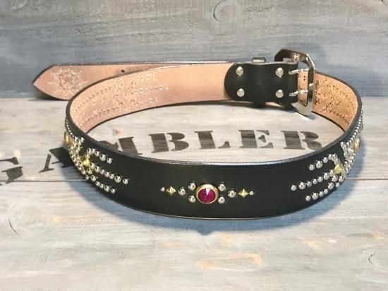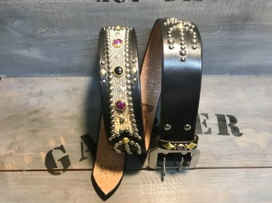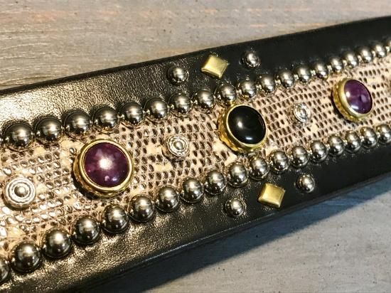 サドルレザーに、エキゾチックレザーの代表格であるリザード(トカゲ革)を使用したスタッズベルト。