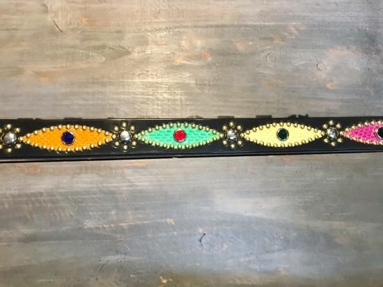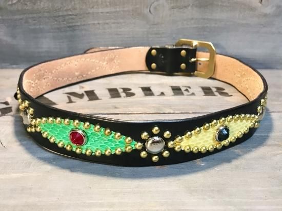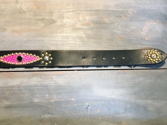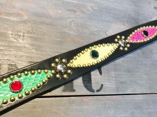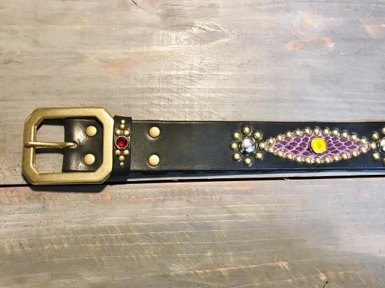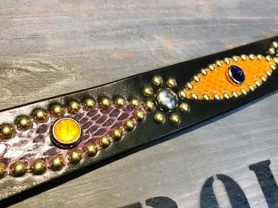 サドルレザーに、色違いのコブラ革を使用したクレイジーパターンのスタッズベルト。