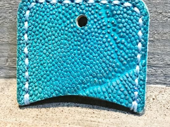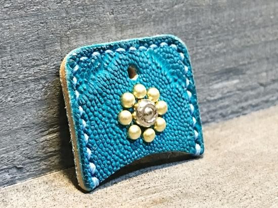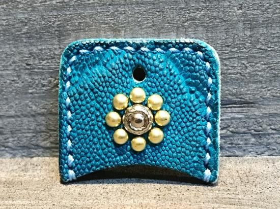 革はターコイズブルー、スタッズ、糸の色合いはお客様から細かく詳細を頂き製作。