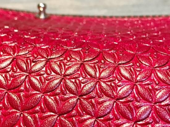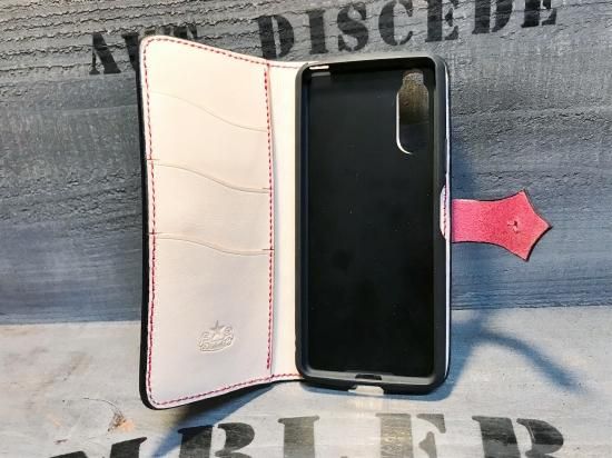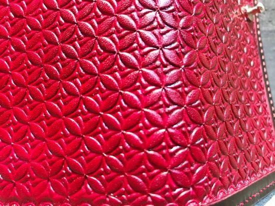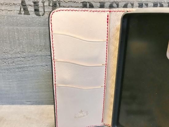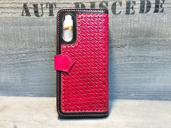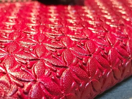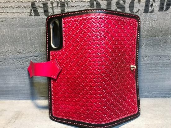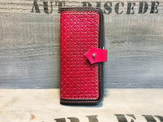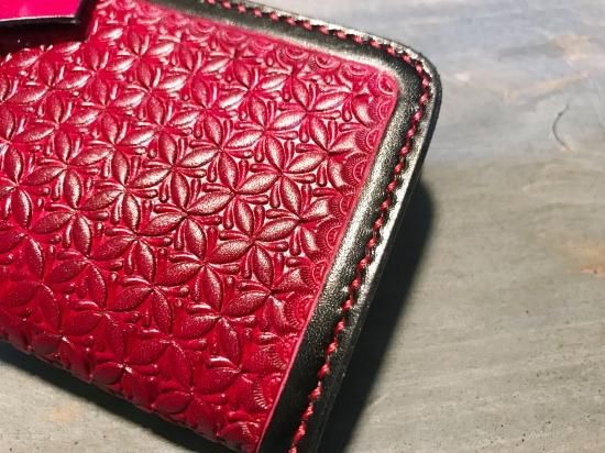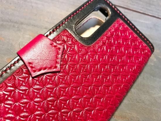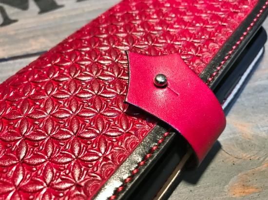 彫りが存在感があり、その後に赤、黒に手染め。使用し易い形で、革がとても手に良く馴染み、お客様の使用しているスマートフォンのサイズに合わせて製作。又、カード収納をセットし、使い込む程に出る革の経年変化が味わえるスマートフォンケースに完成しました。
