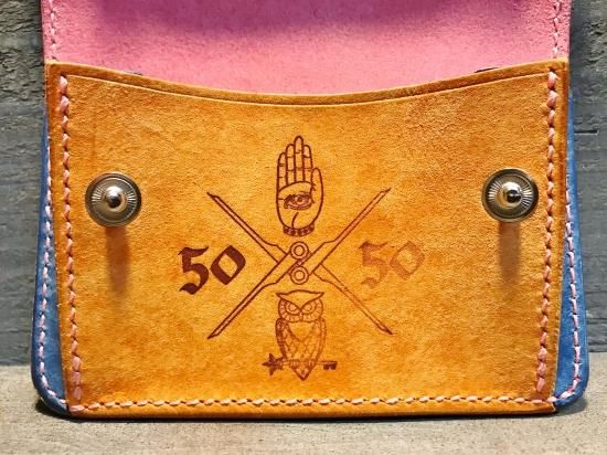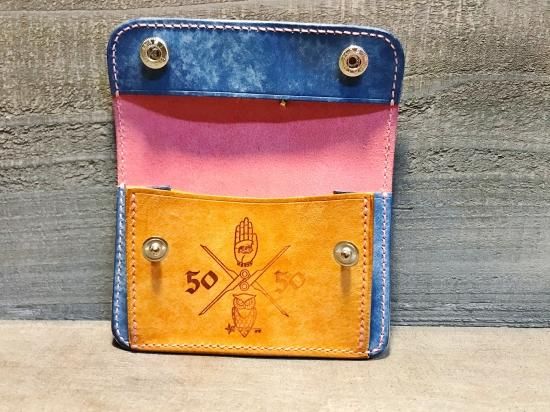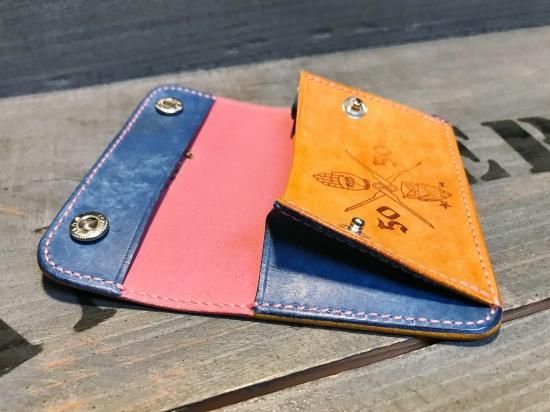 ピンク、青、黄色、オレンジとマルチカラ―のコンビで、蓋の部分にフラワースタッズをセットし、ご要望でJUNK HEADのマークの焼き印を入れて製作。