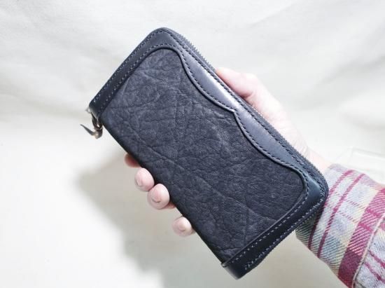 ゾウ革とサドルレザーを使用したラウンドジップウォレット。