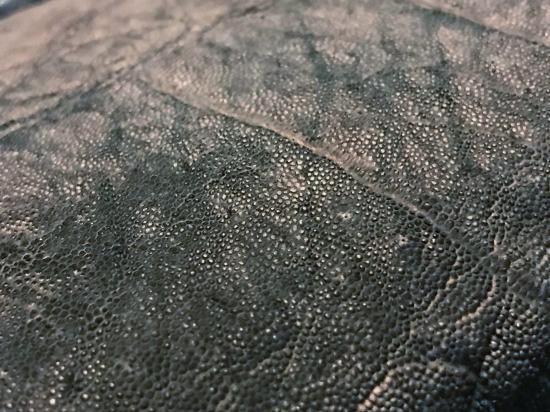 ゾウ革の特徴は、厚く丈夫で特有の大きなヒダ、シワがあり、細かい粒状が特徴で、