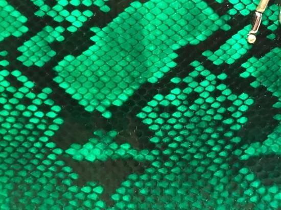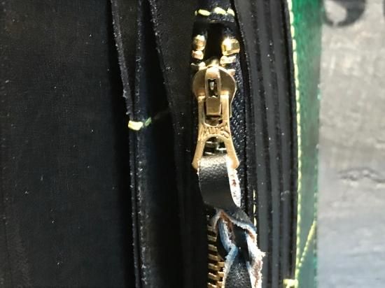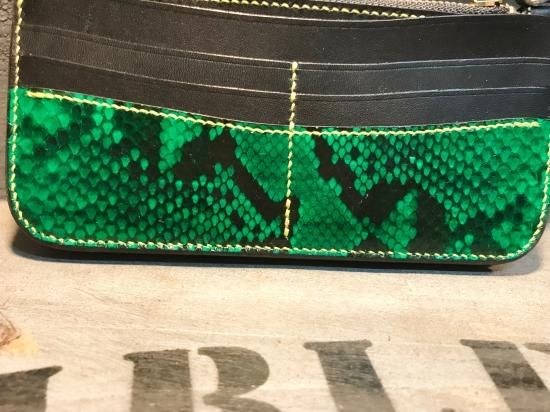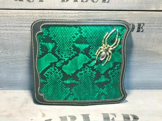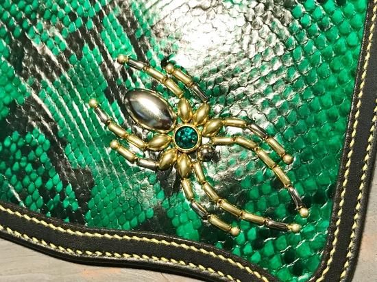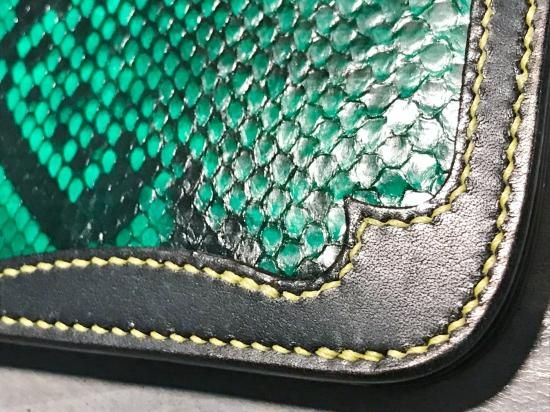 ダイヤモンドパイソンを緑で染色。最大の特徴の柄を消してしまわない様色を調整しながら染色し、オーダーならではのスパイダーをセット。中はカード収納、札入れを多くし、カード入れ部分にもダイヤモンドパイソンをセットしました。