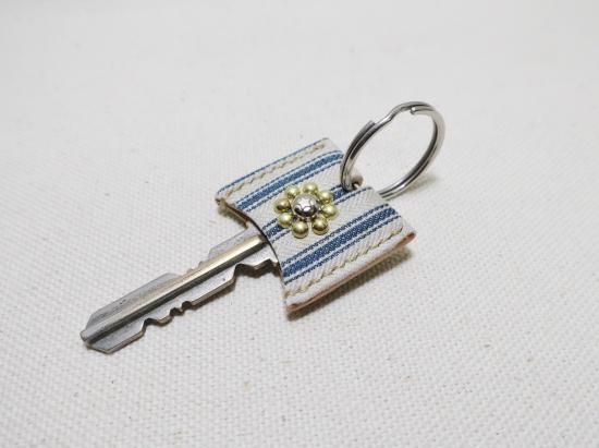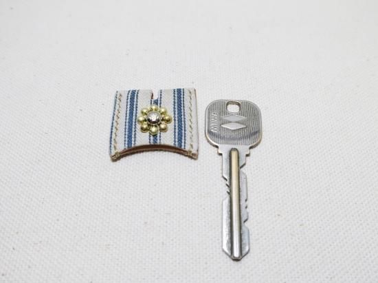 スタッズキーカバー/アンティーク生地/鍵カバー/ティッキング生地/ハンドクラフト/1900年代/レザークラフト/手縫い/革小物
