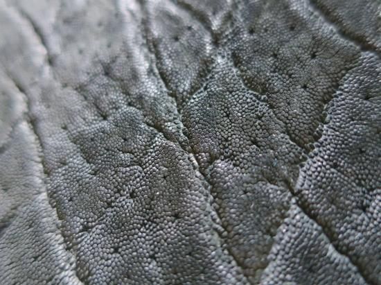 ゾウ革は厚く丈夫で特有の大きなヒダ、シワがあり、細かい粒状に隆起が特徴で、