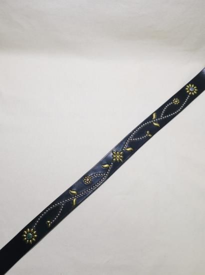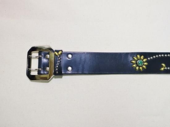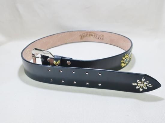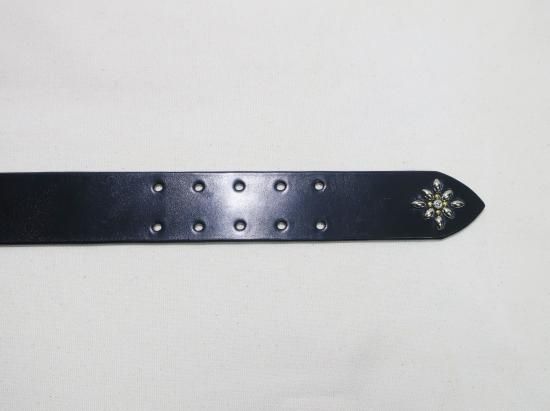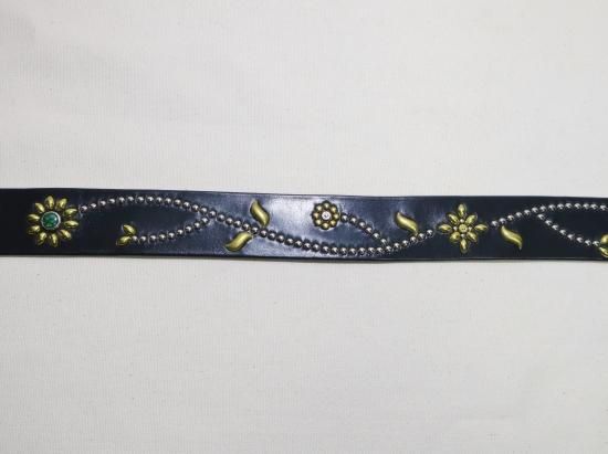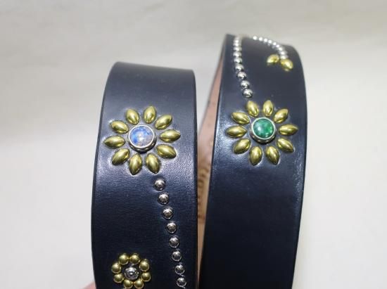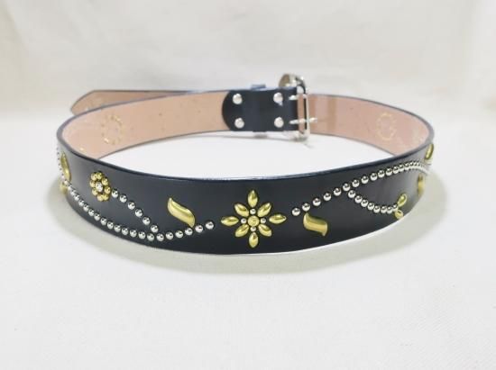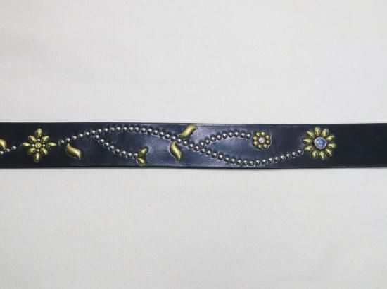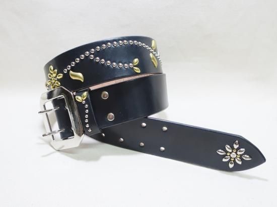 スタッズとラインストーンを肉厚のサドルレザーに打ち込んだフラワーモチーフが美しく、