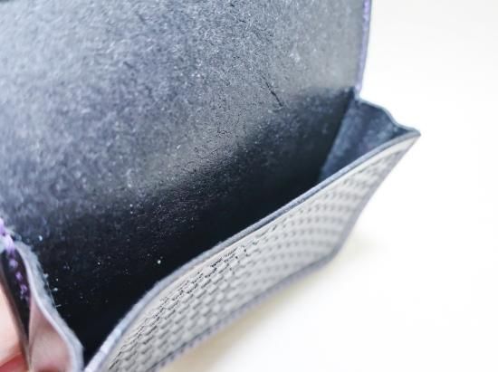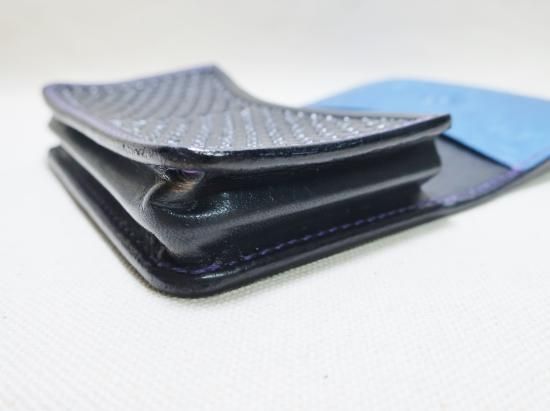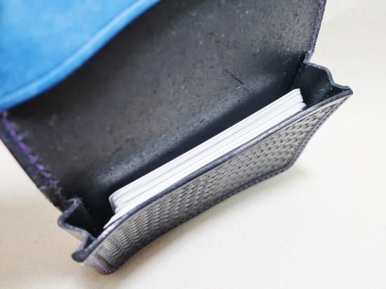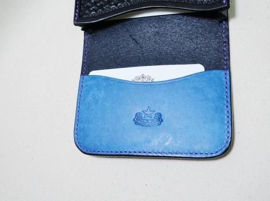 丁寧に打ち込まれたスタンプの彫りが深く存在感があり、堅牢な革に相反して、使い込む程深い味わいが増し、お客様のご希望で内側は50枚程度収納出来る様にし、オーダーならではの組み合わで、使い込む程に変わる変化を楽しみながら使用出来るカードケースに完成しました。