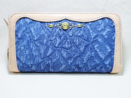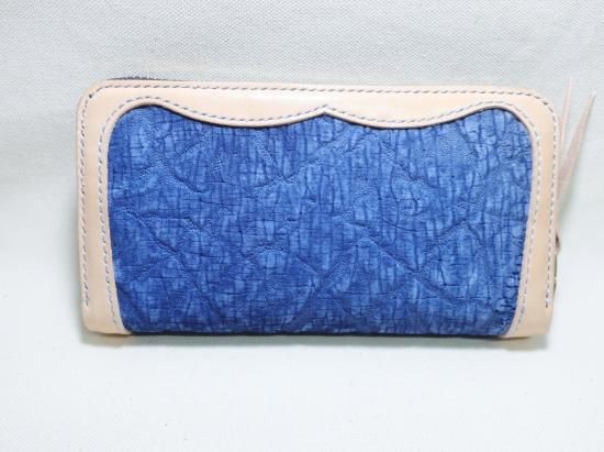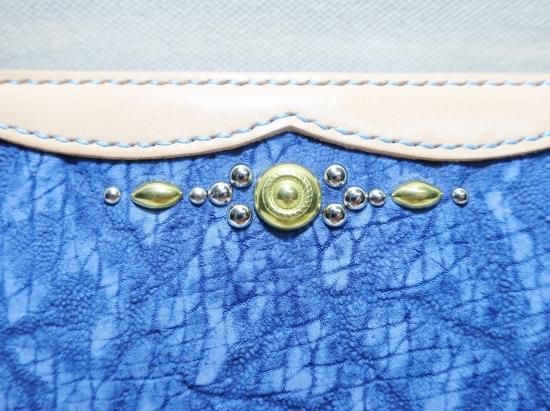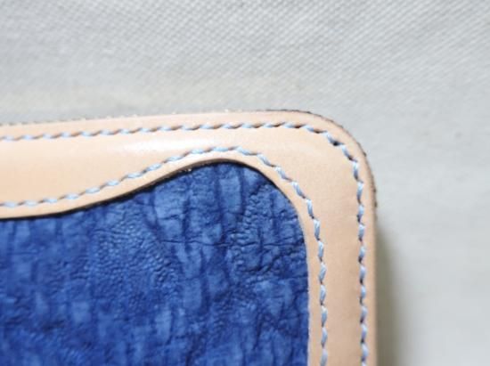 何度もご来店頂き、表側はカバ革のアイリスブルーを使用。縁はナチュラルなサドルレザーを使用しスタッズはお任せ。