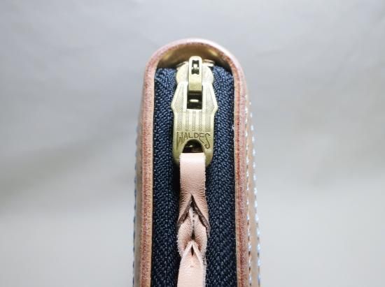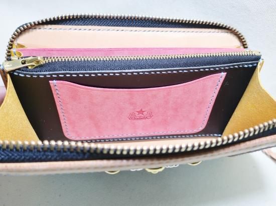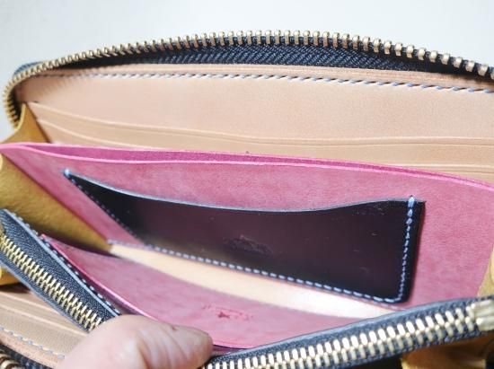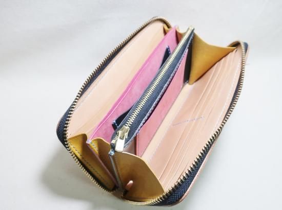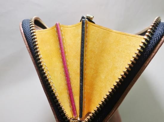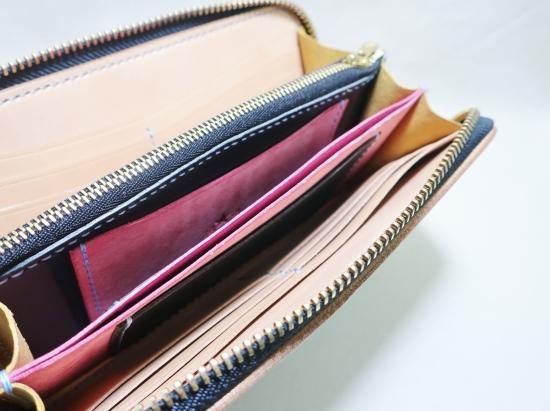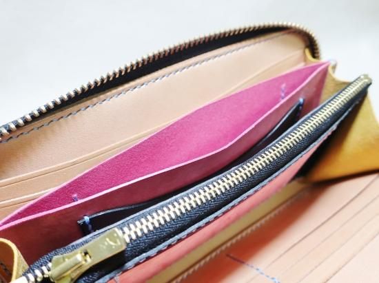内側は、ピンク、黄色はショルダーレザー、黒とナチュラルはサドルレザーを使用しマルチカラ―で製作。又、通常には無い仕切りを1か所追加でセット。使用し易さ、使い勝手も良く、素材全ての良さが現れ、オーダーならではの組み合わせのラウンドジップウォレットに完成しました。