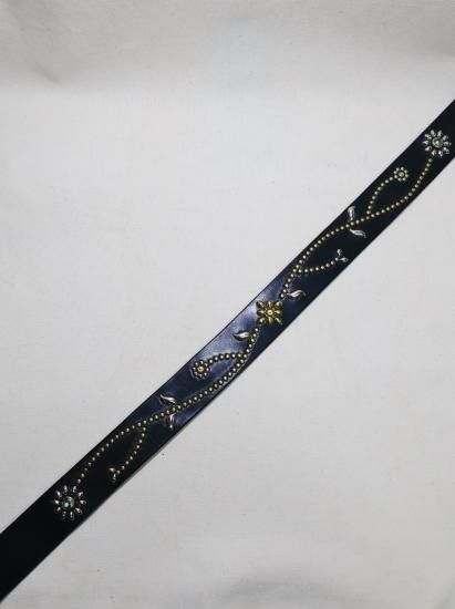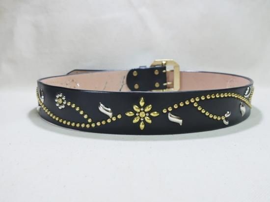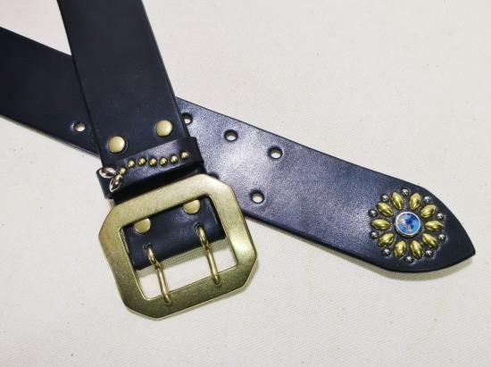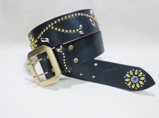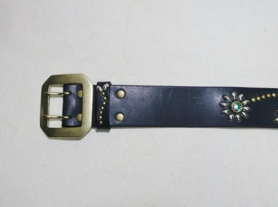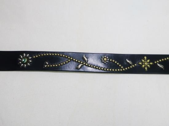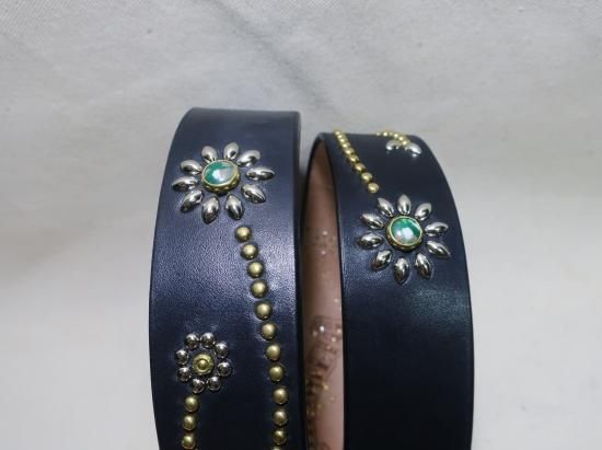スタッズとラインストーンを肉厚のサドルレザーに打ち込んだフラワーモチーフが美しく、